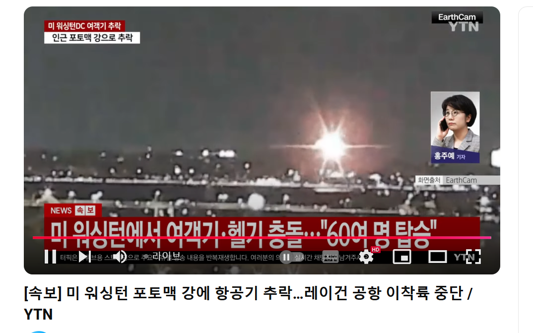 오늘은 미 워싱턴DC 여객기 추락사고가 일어남.